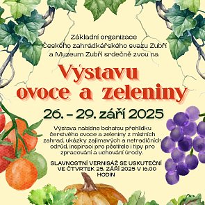 - Výstava ovoce a zeleniny (Muzeum Zubří, 25. 9. - 29. 9. 2025 pa - ne 9:00 - 17:00, po 9:00 - 12:00)